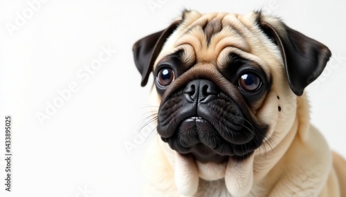 Close-up of a single pug, pure white backdrop, face, domestic