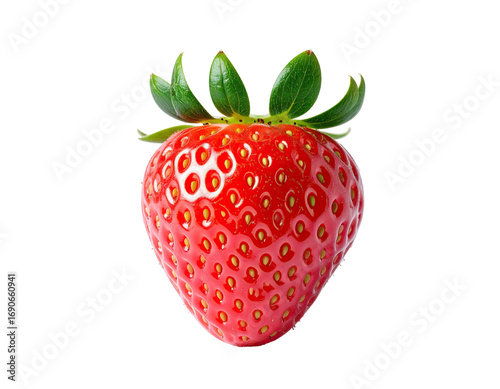 Close-up of a single, vibrant red strawberry with green leaves atop
