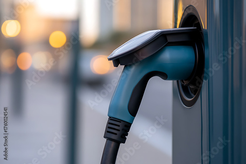 Close-up of a sleek, blue electric vehicle charging station, poised and ready to power the future of sustainable transportation in an urban setting. #electricvehicle