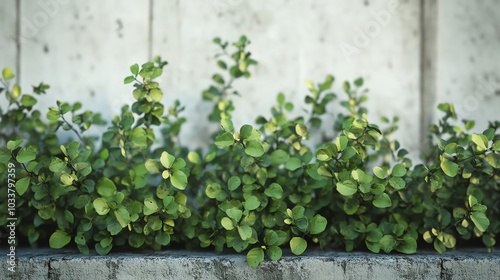 Closeup of a small forest growing along a city highway, leaves contrasting with the concrete, white background
