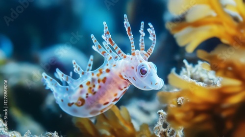 Closeup of a Small White and Pink Sea Slug Among Orange Coral