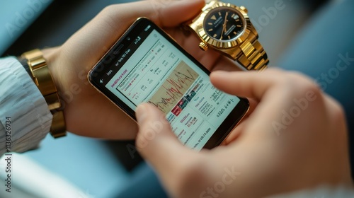 Close-up of a smartphone displaying financial news from a US media outlet, a gold watch on the same wrist holding the phone