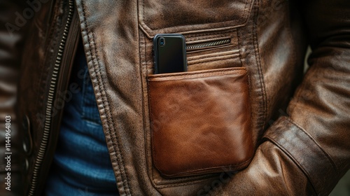 Close-up of a smartphone in a leather jacket pocket.