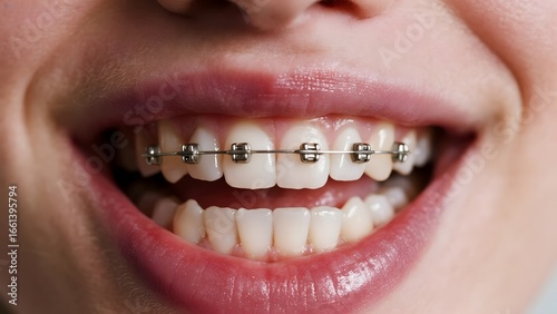 Close-up of a smiling mouth with dental braces on the upper teeth