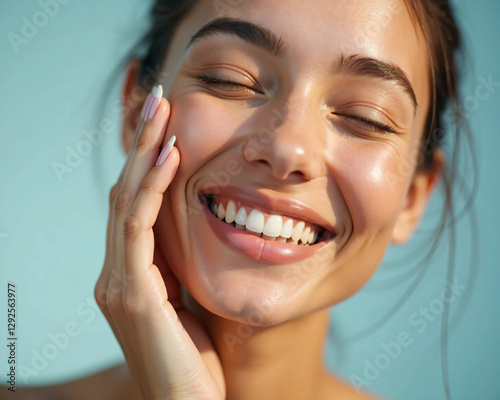 Close-Up of a Smiling Woman with Glowing, Radiant Skin, Soft Natural Lighting, Pastel Blue Background, Fresh and Minimalist Aesthetic, Beauty and Skincare Concept, Self-Care and Wellness Inspiration