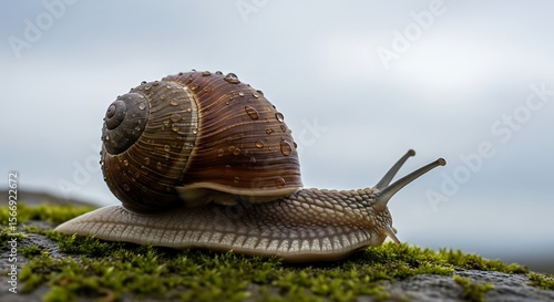 Close-up of a Snail on Mossy Rock, Water Droplets on Shell