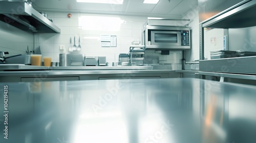 Close-up of a spotless commercial kitchen, with gleaming stainless steel countertops and a visible food safety certification proudly displayed on the wall.