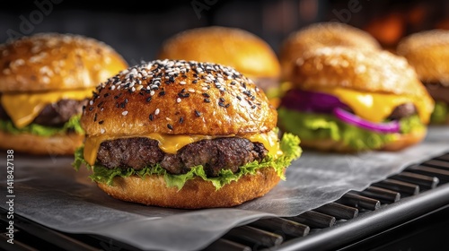 Close-up of a stack of gourmet hamburgers-1 - condiments stacked detail
