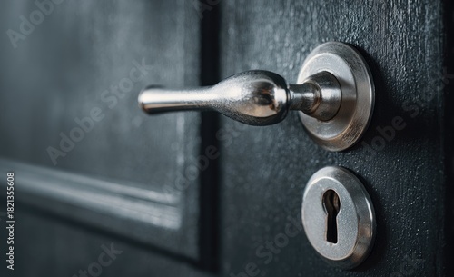 Close-up of a tarnished, metallic door handle and keyhole on a dark, textured panel