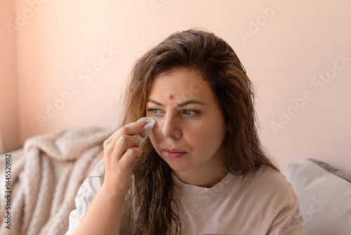 Close-up of a teenage girl with pimples using a cotton pad to apply toner on her face. Highlights home skincare routine, acne care, and gentle facial treatment.