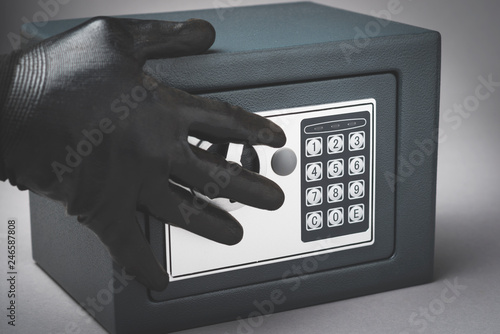 Close-up Of A Thief's Hand Wearing Gloves Unlocking Safe