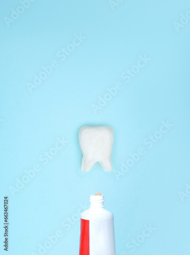 Closeup of a toothpaste and tooth model on blurred blue background. Means to care for the oral cavity.