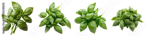 Closeup of a variety of freshly harvested aromatic green herbs like basil and mint leaves displayed on a plain white background