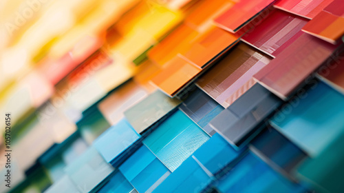 Close-up of a vibrant, layered tile arrangement featuring a gradient of colors from warm yellows to cool blues in an abstract design