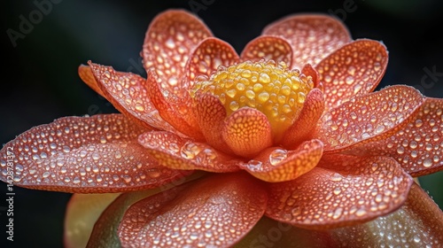 Close-up of a vibrant orange flower covered in dew drops. Petals are textured and detailed