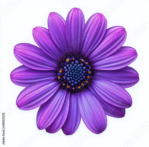 Close-up of a vibrant purple daisy flower with detailed petals and a textured center on a white background