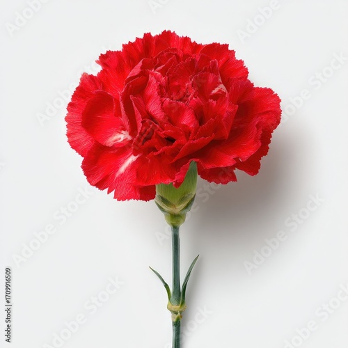 Close-up of a vibrant red carnation against a plain white background. The flower is in full bloom, with densely packed petals exhibiting a slightly darker red center.