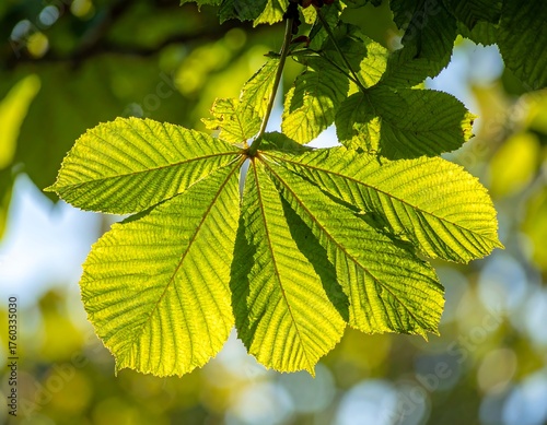 Close-up of a vibrant, sunlit, multi-lobed leaf