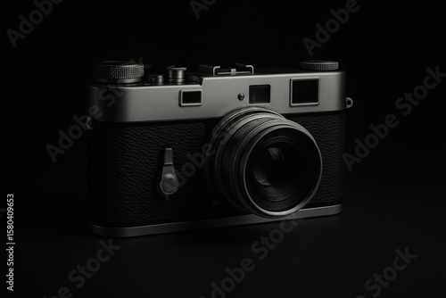 Close-up of a vintage camera against a dark backdrop