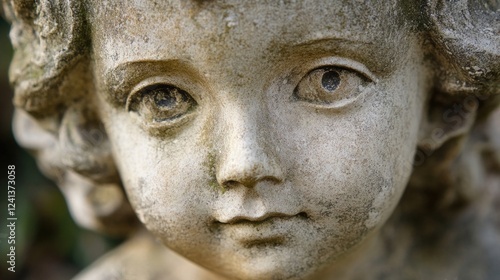 Close-up of a vintage stone child sculpture with curly hair and detailed facial features, set against a blurred green background.