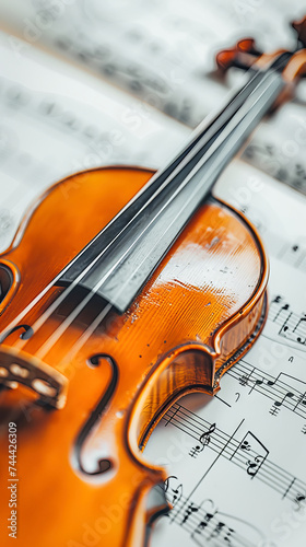Closeup of a violin over music sheets. Classical music concept.