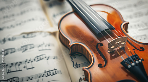 Closeup of a violin over music sheets. Classical music concept.