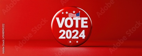 Close-up of a "VOTE 2024" text button, designed with stars and a waving flag, emphasizing civic duty and voter engagement in the 2024 elections, 3D illustration