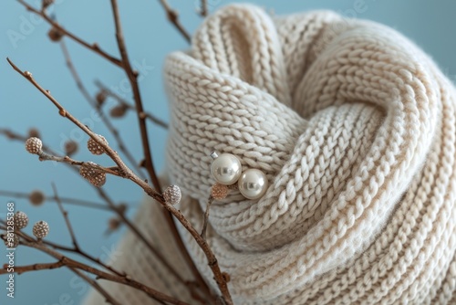Close-up of a white knitted scarf with pearl earrings and twigs.