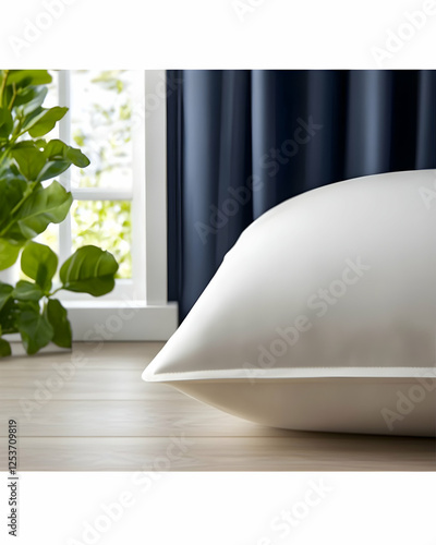 Close-up of a white pillow on a wood floor near window with plants. Comfortable sleep concept for advertising bedding