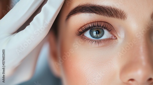 Close-up of a woman receiving an eye examination in a bright medical office during the day