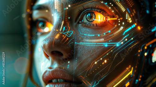 Closeup of a woman wearing orange and blue cyber techology in her face