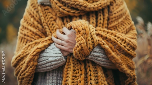 Close-up of a woman wrapped in a chunky mustard knit blanket, symbolizing warmth and comfort in a cozy autumn setting.