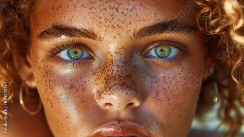 Closeup of a woman's face with curly hair, bright sun highlighting her blue eyes and freckles, creating a cinematic and vibrant effect.
