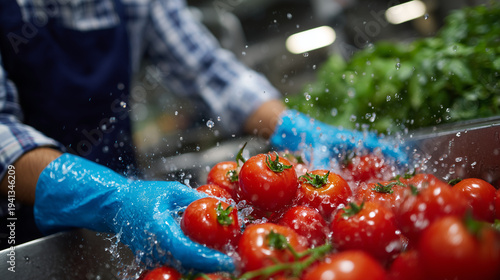Close-up of a worker carefully sanitizing fresh tomatoes under running water, bright reflections highlighting wet surfaces, stainless steel background softly blurred, emphasizing f