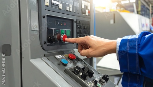 Close-up of a worker pressing a red button on a machine control panel.
