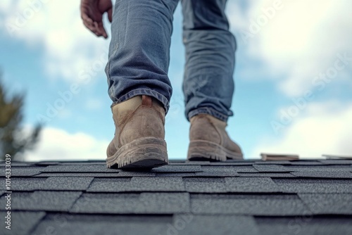 Close-up of a worker's hand setting the final shingle on a roof, with work boots and grey jeans under a sunny blue sky. Generative AI