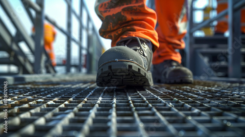 Close-up of a worker's safety boot on a metal grid walkway at an industrial site, with other workers in the background.