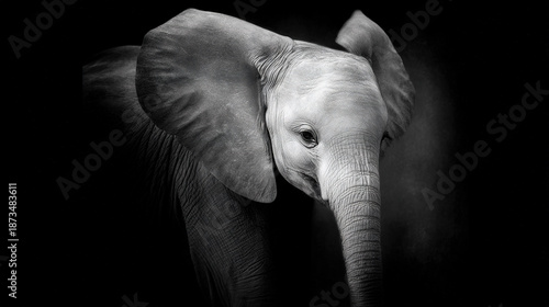Close-up of a young elephant's trunk and ear in black and white