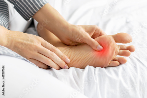 Close-up of a young woman feeling pain when pressing on her foot. Painful female legs from uncomfortable tight shoes and high heels, sprains, spasms. Healthcare, health problems, inflammation concept.