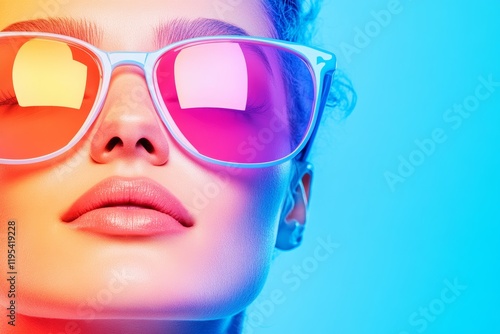 Close-up of a young woman's face, wearing vibrant sunglasses against a blue backdrop. A summery, colorful vibe.