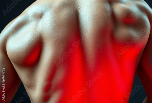 Close-up of aching lower back, showing muscle tension and curvature, posture, rehabilitation