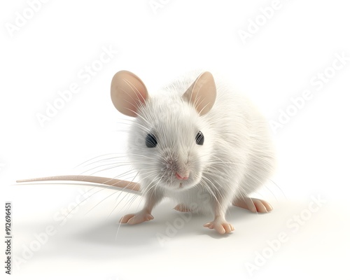 Close-up of an adorable white mouse with large ears and bright eyes, standing on a plain white background in a curious pose.