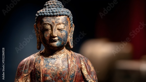 Close-up of an ancient Buddha statue showing intricate details and weathered texture, illuminated against a dark backdrop. Serene and contemplative.