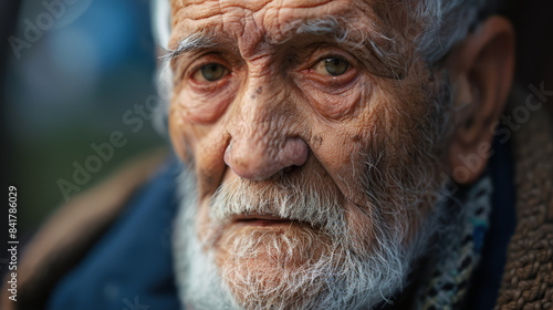 Close-up of an elderly man with a white beard and intense, thoughtful gaze.