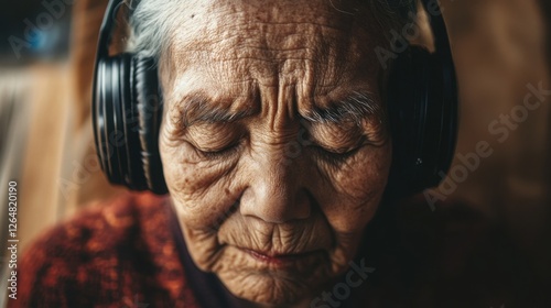 Close-up of an elderly person wearing headphones, eyes closed as if enjoying music, with soft light highlighting their face