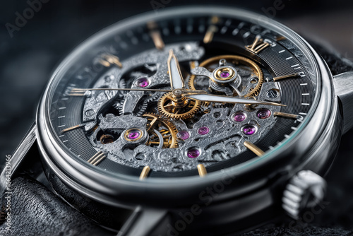 Close-up of an elegant mechanical watch with its intricate inner workings displayed