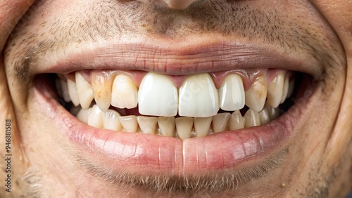 Close-up of an imperfect smile, showcasing unevenly spaced, misaligned, and weathered teeth with visible gaps, cracks, and discoloration, conveying a sense of realism and authenticity.
