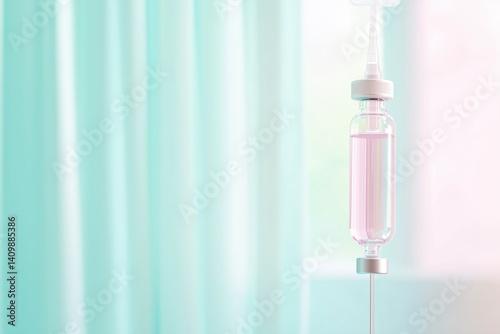 Close-up of an intravenous (IV) drip with pink liquid, set against soft aqua curtains in a hospital room. Minimal, calming medical scene with ample copy space for health-related materials.