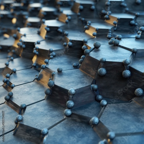 Close-up of an intricate blue and black hexagonal pattern depicting molecular structures.