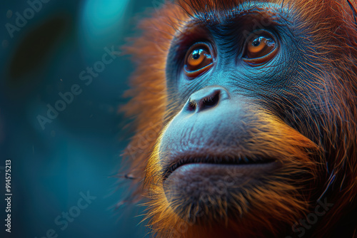 Close-up of an Orangutan's Face with Blue and Orange Hues.